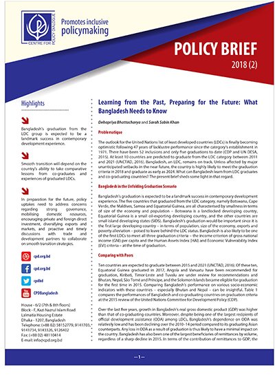 The outlook for the United Nations list of least developed countries (LDCs) is finally becoming optimistic following 47 years of lacklustre performance since the category’s establishment in 1971. There have been 52 inclusions and only five graduations to date (CDP and UN DESA, 2015). At least 10 countries are predicted to graduate from the LDC category between 2011 and 2021 (UNCTAD, 2016). Bangladesh, an LDC, remains on track. Unless affected by major unanticipated setbacks in the near future, the country is highly likely to meet the graduation criteria in 2018 and graduate as early as 2024. What can Bangladesh learn from LDC graduates and co-graduating countries? The present brief sheds some light in that regard.