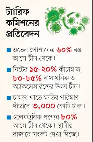 ট্যারিফ কমিশন বলছে, ওভেন পোশাকের ৬০ শতাংশ বস্ত্র আসে চীন থেকে। নিট পোশাকের ১৫ থেকে ২০ শতাংশ কাঁচামাল এবং ডাইংয়ের রাসায়নিকের বড় উৎস চীন। চামড়া খাতে সম্ভাব্য ক্ষতির পরিমাণ দাঁড়াবে ৩ হাজার কোটি টাকা। ইলেকট্রনিক পণ্যের ৮০ শতাংশ আসে চীন থেকে। বিভিন্ন ক্ষেত্রে স্থানীয় বাজারে সংকট পণ্যের দেখা দিচ্ছে বলে উল্লেখ করা হয় প্রতিবেদনে।