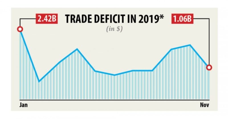 Trade deficit narrowed 79.51 percent in November to $1.06 billion from the previous month on the back of sliding imports — a worrying development as it suggests of sluggishness of the economy.