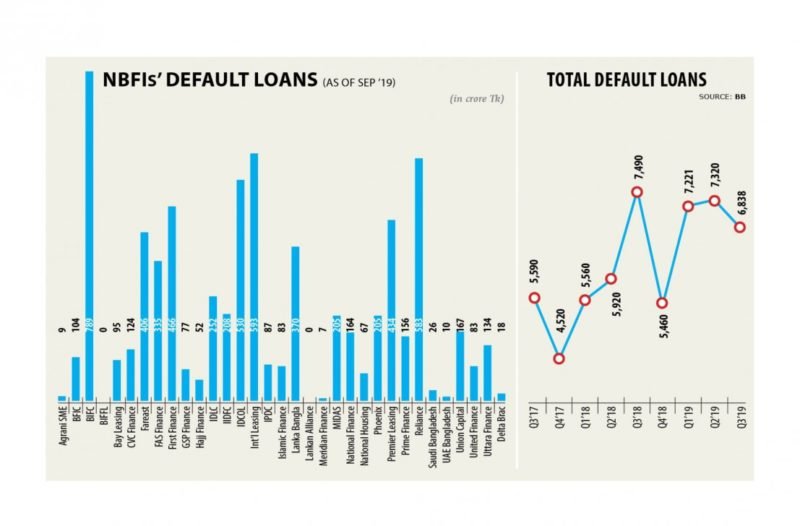 At the end of September, the total default loans in NBFIs amounted to Tk 6,838 crore, up 25.23 percent from six months earlier, according to data from the central bank.
