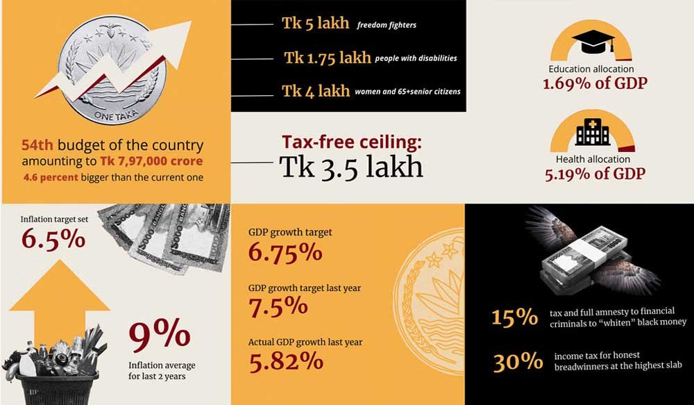 With a size of Tk 7,97,000 crore, the FY2024-25 budget is equivalent to 14.2 percent of the GDP, which is the same as the revised budget of the outgoing fiscal year.